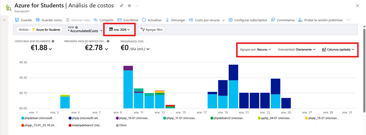 En aquesta secció, podem obtenir un gràfic de les despes de la subscripció, filtrant per data, agrupant recursos, regions, i el tipus de gràfic a mostrar (columnes, àrea, etc)