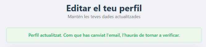 Si hem modificat el correu electrònic, esborrarem qualsevol codi de verificació que s’hagi desat a la sessió i mostrarem un missatge diferent al genèric, recordant que s’ha de tornar a verificar el correu electrònic.