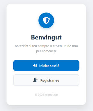 A la pàgina inicial de l’aplicació trobem principalment dos botons. El primer convida a un usuari existent a iniciar sessió a l’aplicatiu, mentre que l’altre anima a un usuari que encara no és part de l’ecosistema a registrar-se.